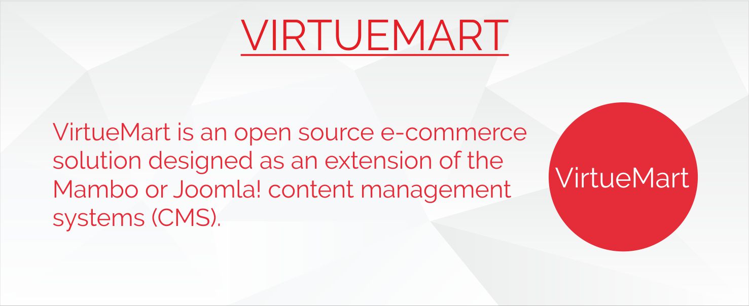 VirtueMart is popular open source ecommerce development solution. It must only be used with Joomla or Mambo Content Management System. Both of these are released under the General Public License, so they are freely available for download and use. As Joomla and Mambo are CMS they can further enhanced by installing 3rd party Extensions like VirtueMart and Mambots.